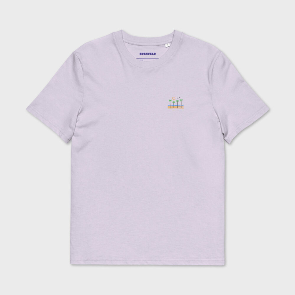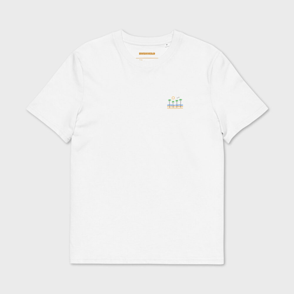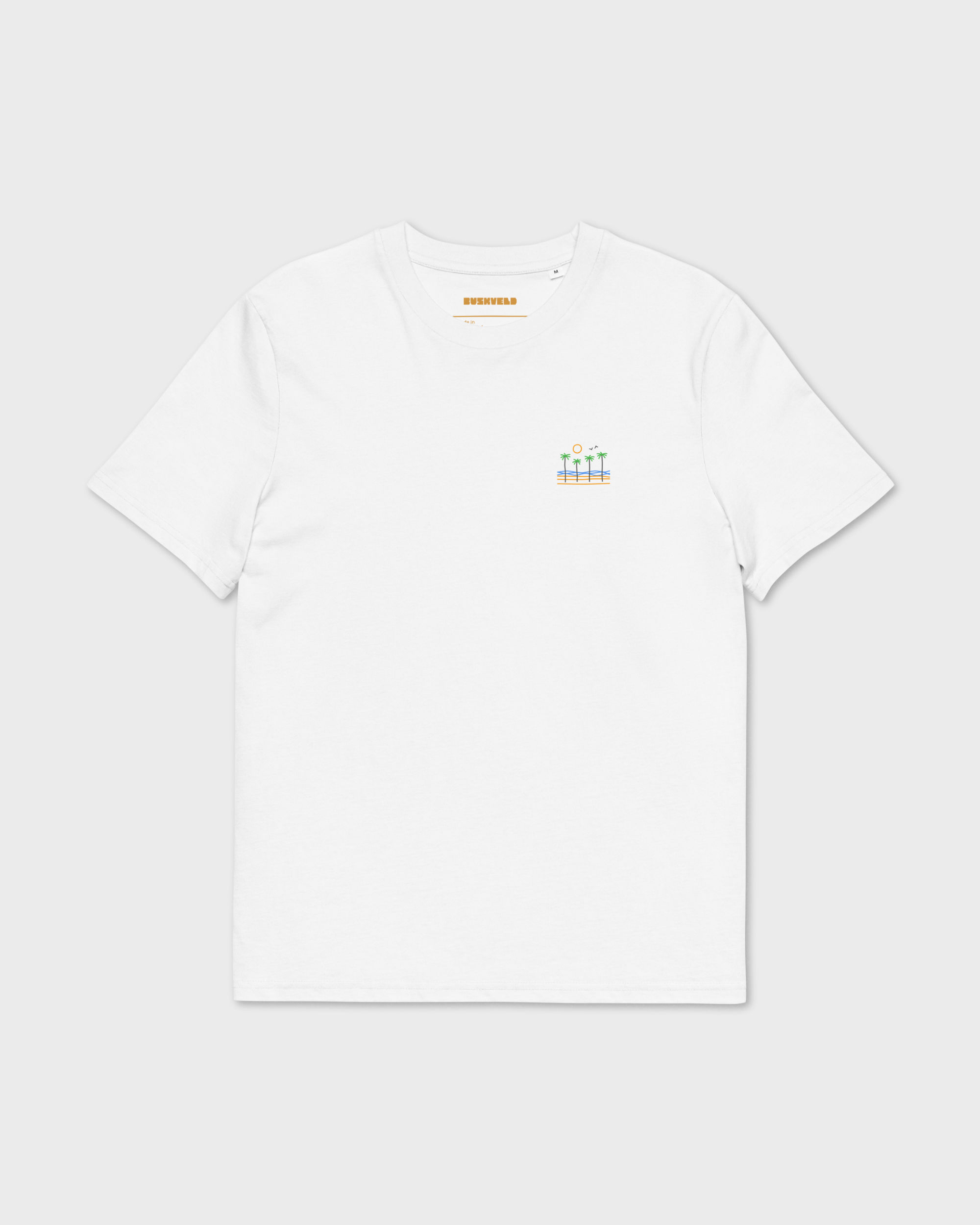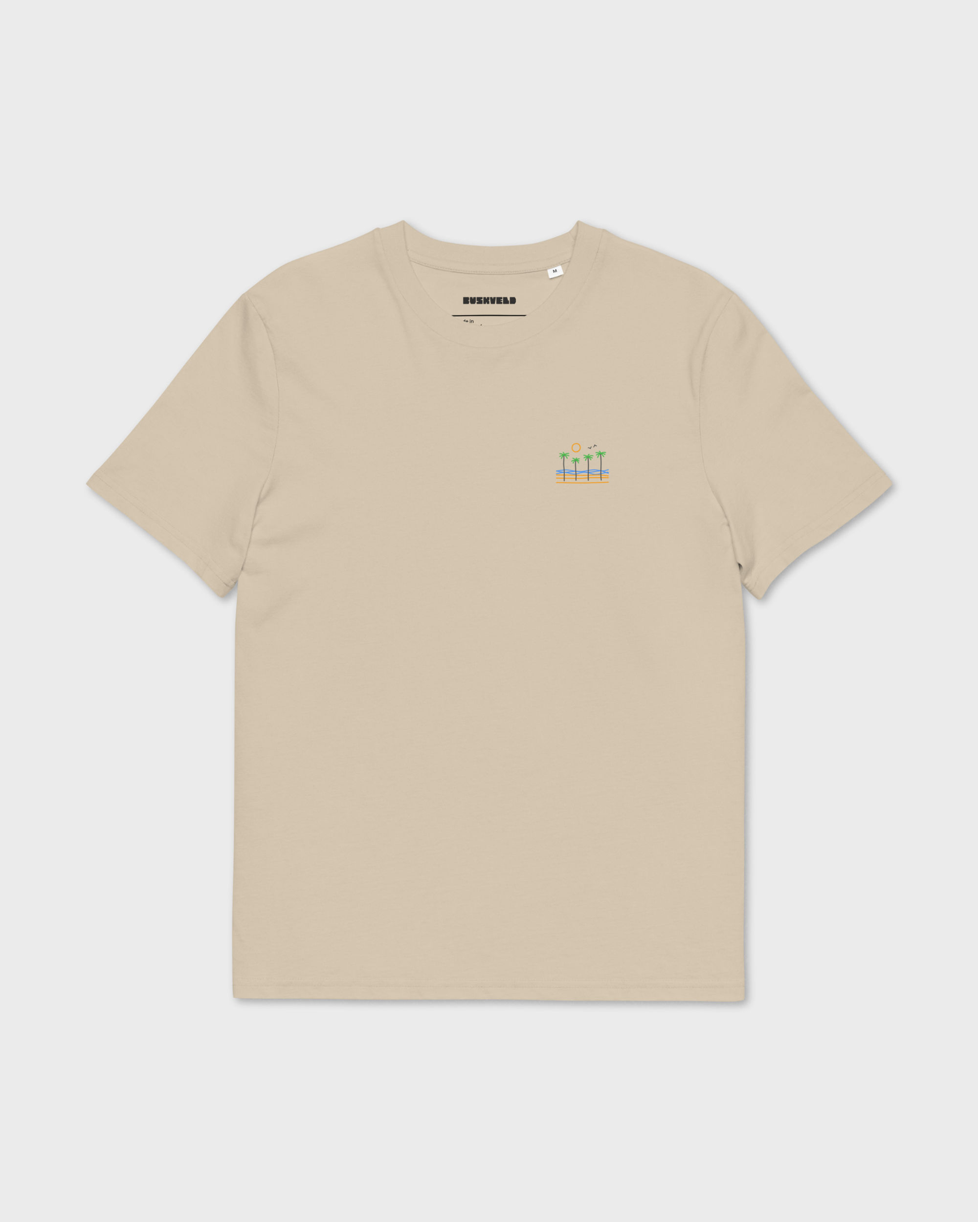 Embrace summer vibes with this essential eco-friendly tee. Made from incredibly soft 100% organic cotton, it features a minimalist graphic of palm trees, waves, and a sun for effortless tropical beach vibes.