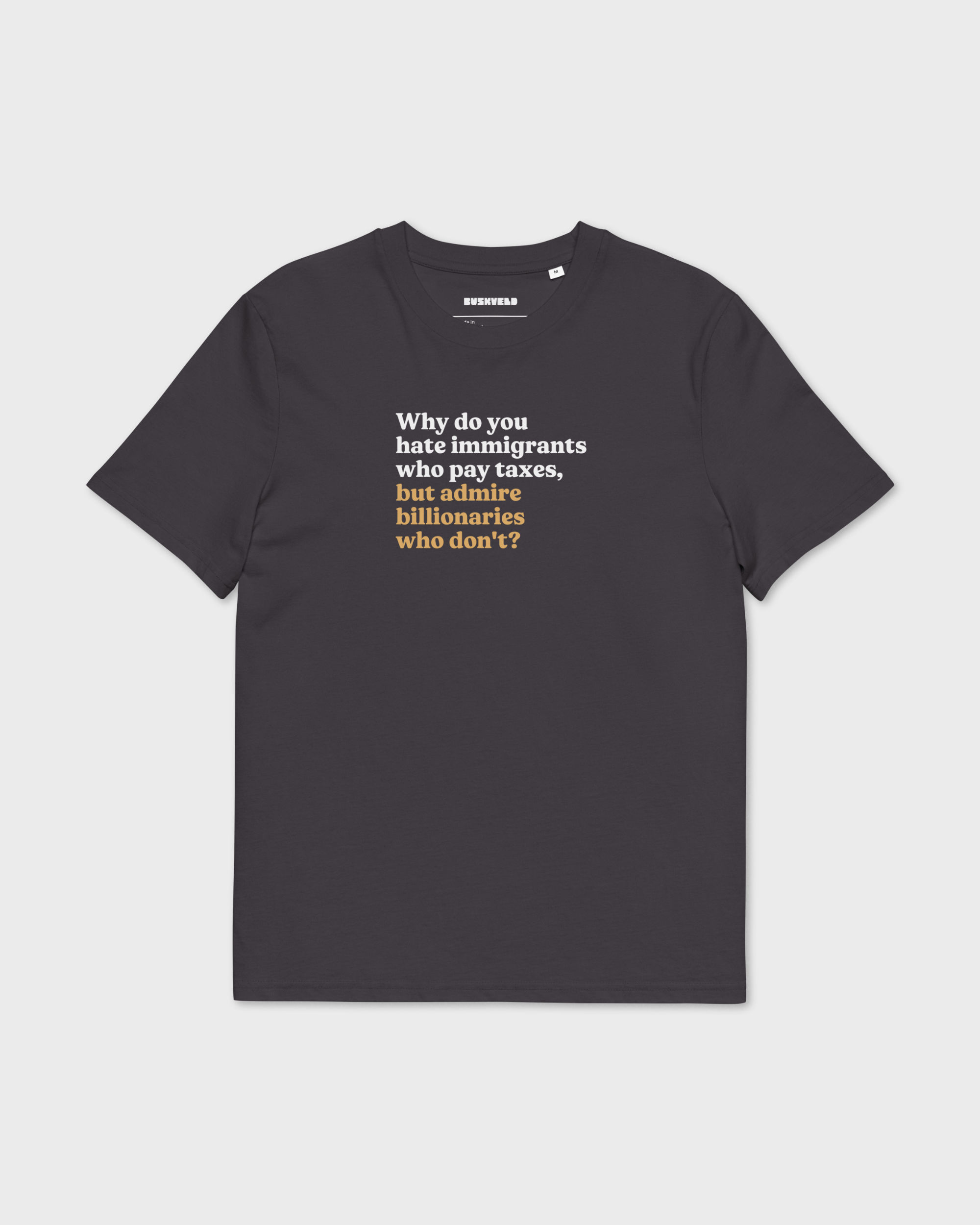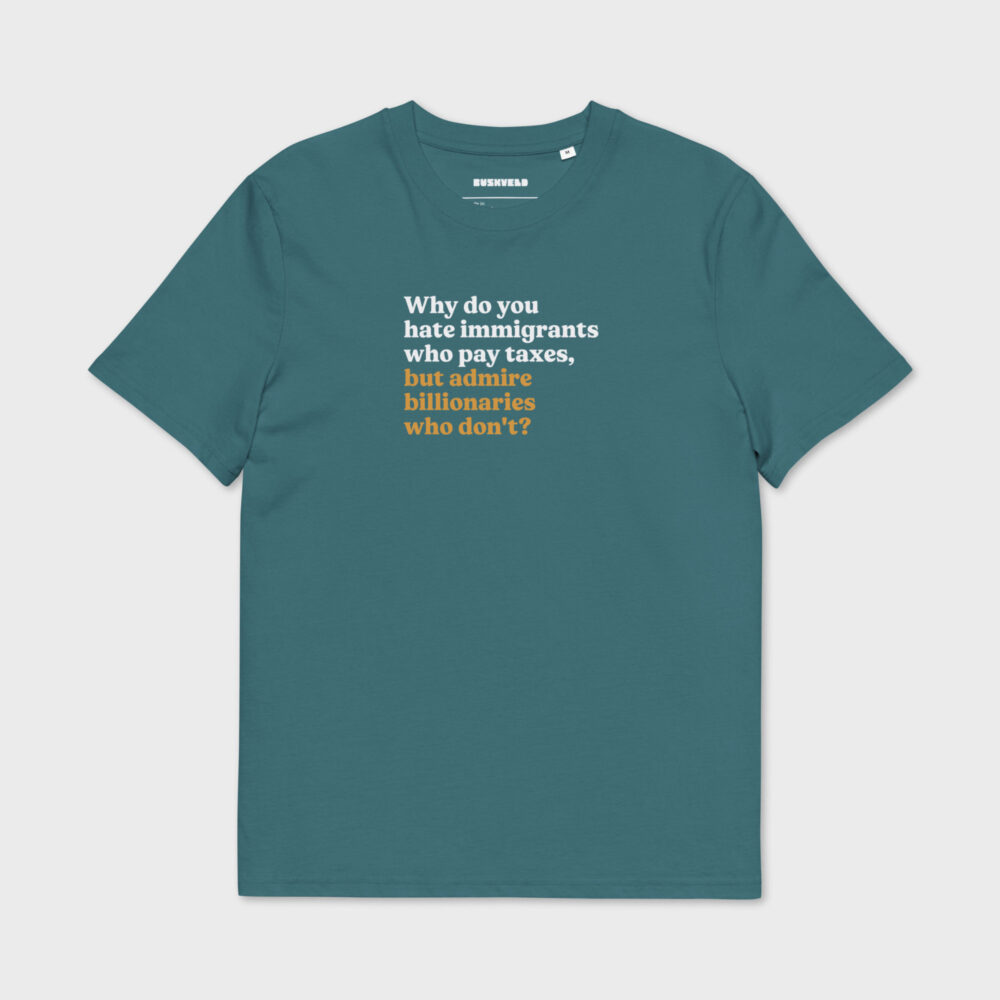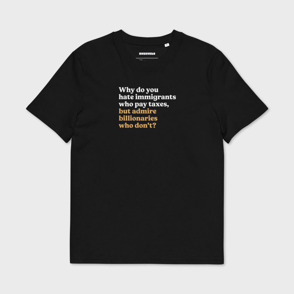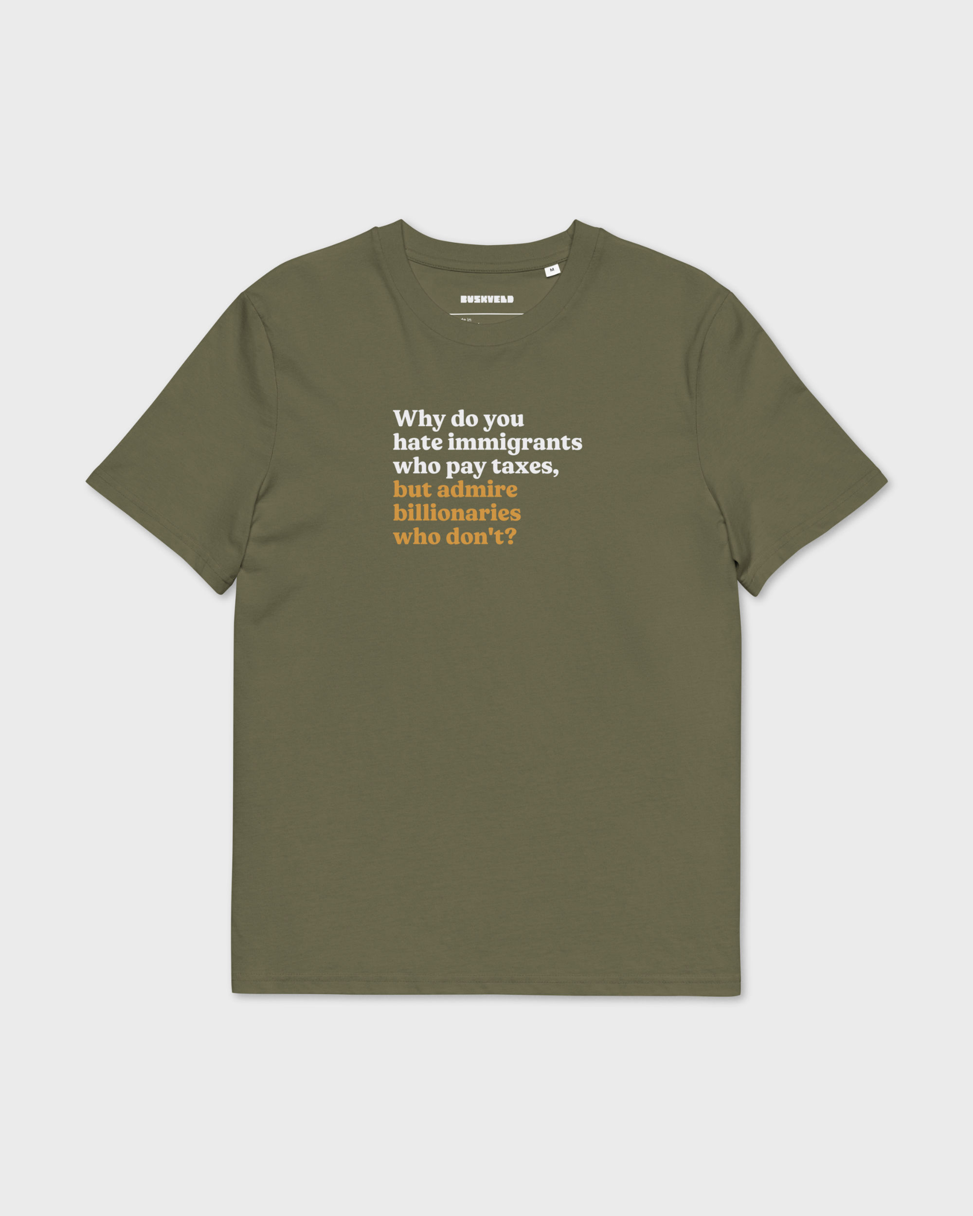 More than a t-shirt — it’s a statement. Made from 100% organic ring-spun cotton, this high-quality, comfortable unisex tee is designed for both style and impact. Its graphic presents a direct critique of discriminatory anti-immigration laws, challenging the political hypocrisy that ignores and abuses fundamental human rights. Wear your values.